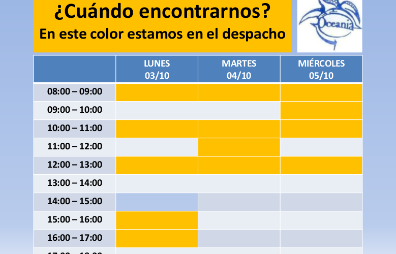El plazo de inscripciones se amplía 3 días más, hasta el 5 de octubre. Acérquense al despacho en el horario señalado en la imagen y si no pueden en dicho horario, mándennos un correo a oceaniacontacto@gmail.com ¡Muchas gracias y les esperamos!
