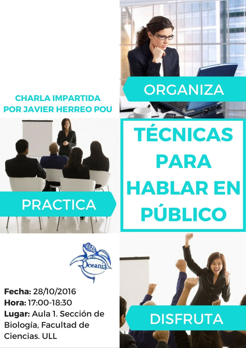 No se pierdan este viernes 28 de octubre, la charla sobre "Técnicas para hablar en público" impartida por Javier Herrero Pou, fundador del club de oratoria de la Universidad de La Laguna. Te esperamos a las 17:00 h en el aula 1 de la Facultad de Ciencias, Sección de Biología.